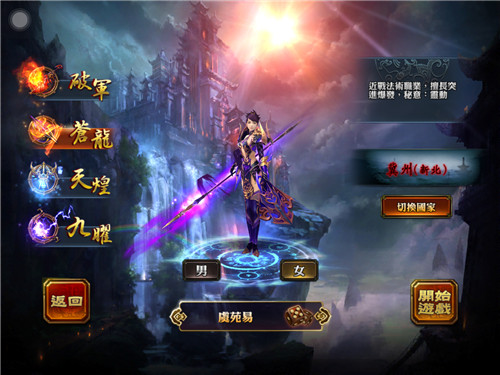 進入遊戲以後的角色創建介面,刀槍弓仗四大職業各有特色哦(近戰:破軍和蒼龍,遠程:天煌和九曜),少俠一定別忘了在右側選擇自己的出生國家。