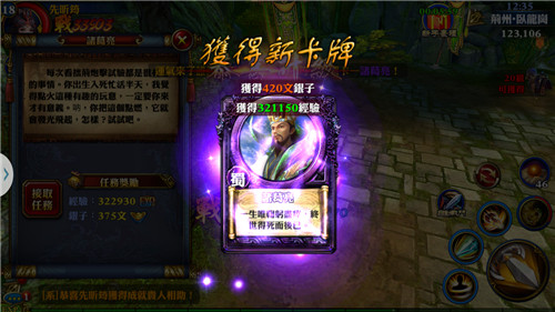 繼續做主線任務,各位少俠注意哦,12級升到13級,需要多做幾個任務才能升,跟著引導做即可,很快就可以升到14級了,這時也學會了第三個技能,往下做任務升到15級,隨後解鎖卡牌介面,得到第一張紫卡,卡牌對人物屬性的加成也是很大的哦。