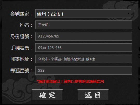 step2、選擇要加入的國家,並填寫相關資訊(包括:參戰國家,姓名,身份證號,手機號碼,郵寄地址,郵遞區號)