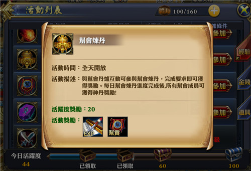 活動描述:與幫會丹爐互動可參與幫會煉丹,完成要求即可獲得獎勵,每日幫會煉丹進度完成後,所有幫會成員可以獲得神丹的獎勵。
