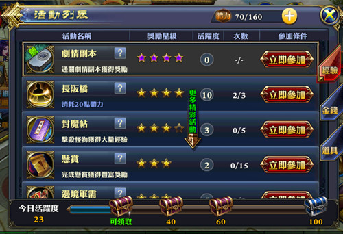 現在來看看遊戲中的活躍度怎麼提升吧,活躍度在遊戲中是跟少俠的在線時長及完成任務的活躍程度有關的。活躍度達到一定數額就可以換取大量道具哦。