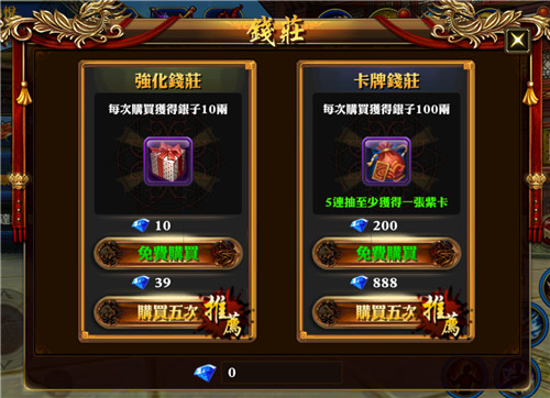 第一個就是錢莊。少俠每次購買時候都會獲得一定的銀兩,其中免費的次數為五次,那麼就可以獲得五十兩金錢,如果額外花費鑽石去抽取卡牌的話,那麼還能獲得更多的鑽石。