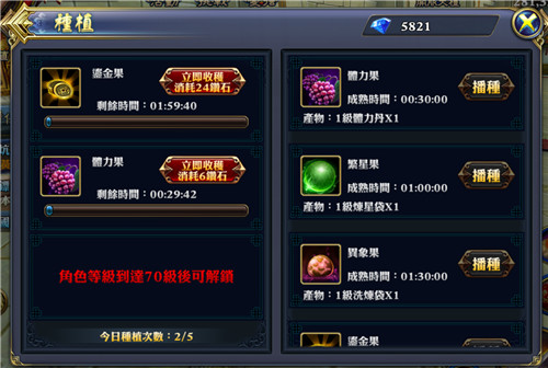 第三個方法就是種植。在六龍御天的活動列表當中,少俠點擊一下道具,就能看到種植玩法的入口了。每位少俠每天有五次的種植機會,本來獲取銀兩的途徑就比較少,而種植能夠固定的有五百銀兩的收入也是相對不錯的哦。