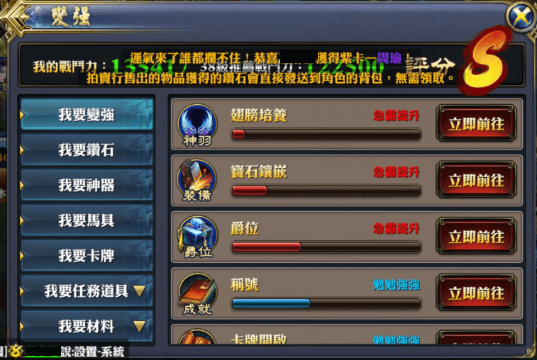想要了解自己的裝備情況和戰力,可以點擊遊戲主界面中的【變強】,進去之後就可以看到自己戰力和當前等級的推薦戰力噢。而且在這個畫面當中,玩家可以看到自己的不足,比如上圖中寶石鑲嵌一欄,系統給出的評價是急需提升,如果點擊“立即前往”,就能跳轉到寶石鑲嵌的地方了,非常方便XD
