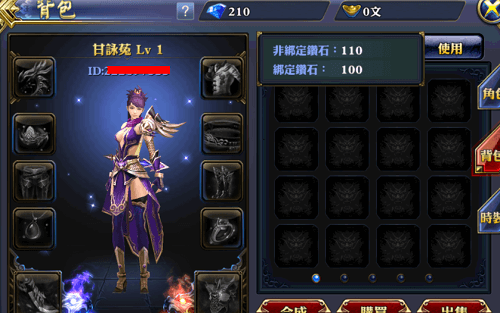 2)手指輕觸背包上的鑽石框,即會顯示非綁定鑽石的數量和綁定鑽石的數量,分別是110非綁定鑽石(儲值獲得),100*綁定鑽石(遊戲內活動獲得);