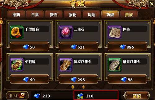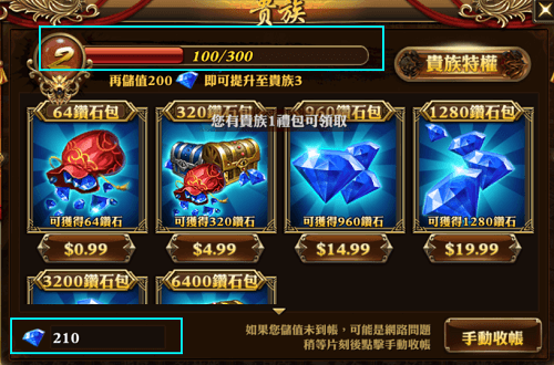 *所以儲值50點MyCard點數卡獲得非綁定鑽石為110,和100點貴族經驗值。