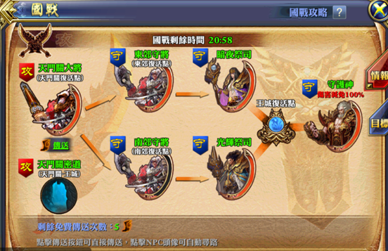 趁著等待的時間,小編也給大家重新普及國戰的小知識。打過國戰的朋友都知道,國戰的勝負判斷條件是以守護神的血量為標準的。30分鐘的國戰時間內,如果守護神被擊殺,則攻擊方勝利,反之進攻方勝利。
