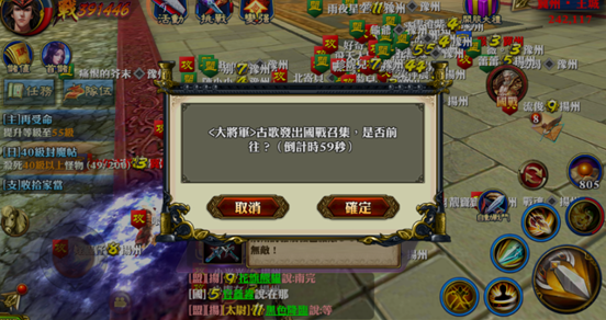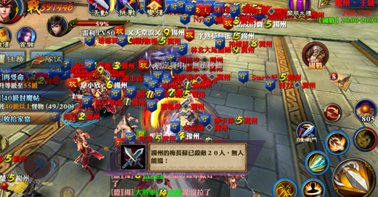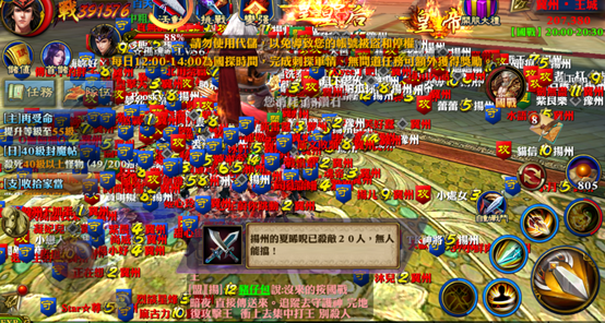 經過幾分鐘的等待,終於進到遊戲。查看了國戰地圖,發現冀州的天門關大將和天門關密道這兩個據點已經被揚州攻佔。看來揚州的進攻真是勢不可擋。小編透過密道,趕到冀州王城。王城處已經聚集了一群豫州盟友,仿佛一切盡在揚州的掌控之中。