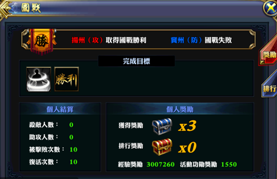 最終,在揚州的強勢進攻下,荊州軍隊被沖散,守護神也被擊敗。本次國戰,揚州獲勝。