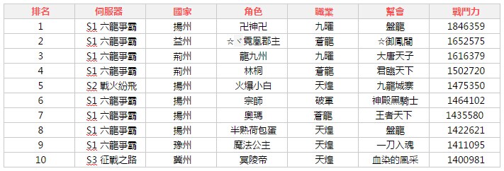 《六龍御天》【百曉生】全服戰力榜10強(11/6)