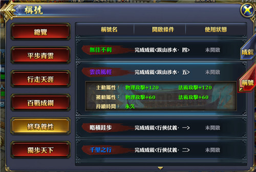 雲淡風輕,這個紫色稱號需要少俠完成成就 跋山涉水系列成就五,這個稱號能夠給少俠帶來如下的屬性加成: