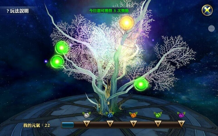神樹活動可以單人完成也可以組隊進行。每天可以獲得3從獎勵。點擊神樹選擇韜略果培育就可以進入到活動中。活動開始後,玩家需要點破神樹周圍游離的元氣來獲取元氣。元氣獲得的越多,得到的果實品質就越高。元氣圈的品質和韜略果實一樣,分為白色。藍色,黃色,綠色,紫色。品質越高的元氣圈需要玩家點擊的次數就越高。遊戲結束後,通過搖動手機就可以摘取果實。