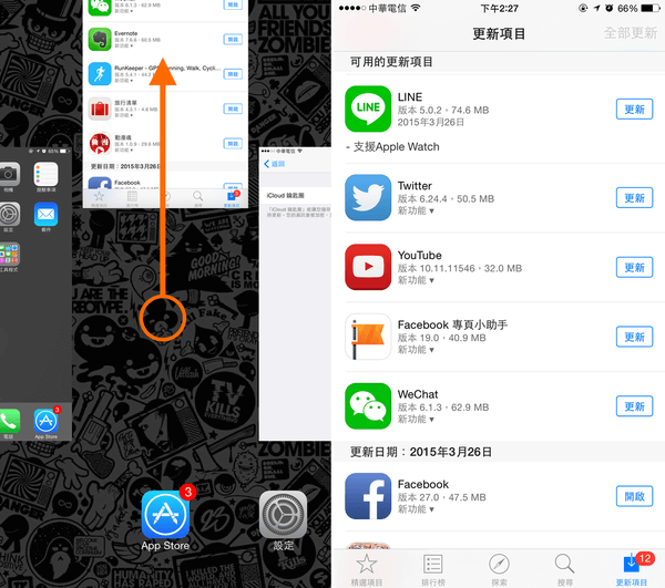 相當多新手還不知點下HOME鍵後,其實APP還是停留在背景多工狀態中,這並非是已經完整關閉APP,要完整關閉重啟,需點HOME兩下,將App Store往上滑動關閉,關閉後在App Store開啟即可。