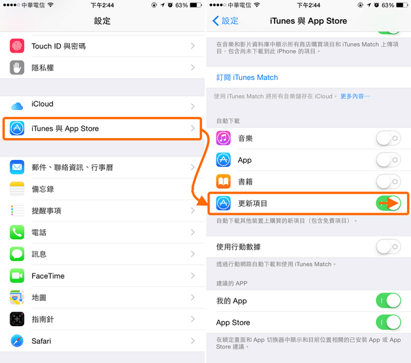 到「設定」>「iTunes 與 App Store」,將「更新項目」自動下載功能給開啟,開啟後提示更新訊息就會消失。