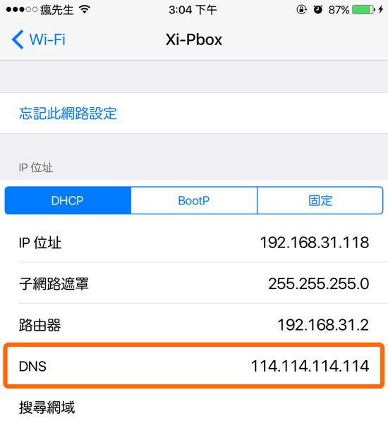 到「設定」>「Wi-Fi」內,點選目前已經連上的WiFi右邊「i」,將DNS改為114.114.114.114